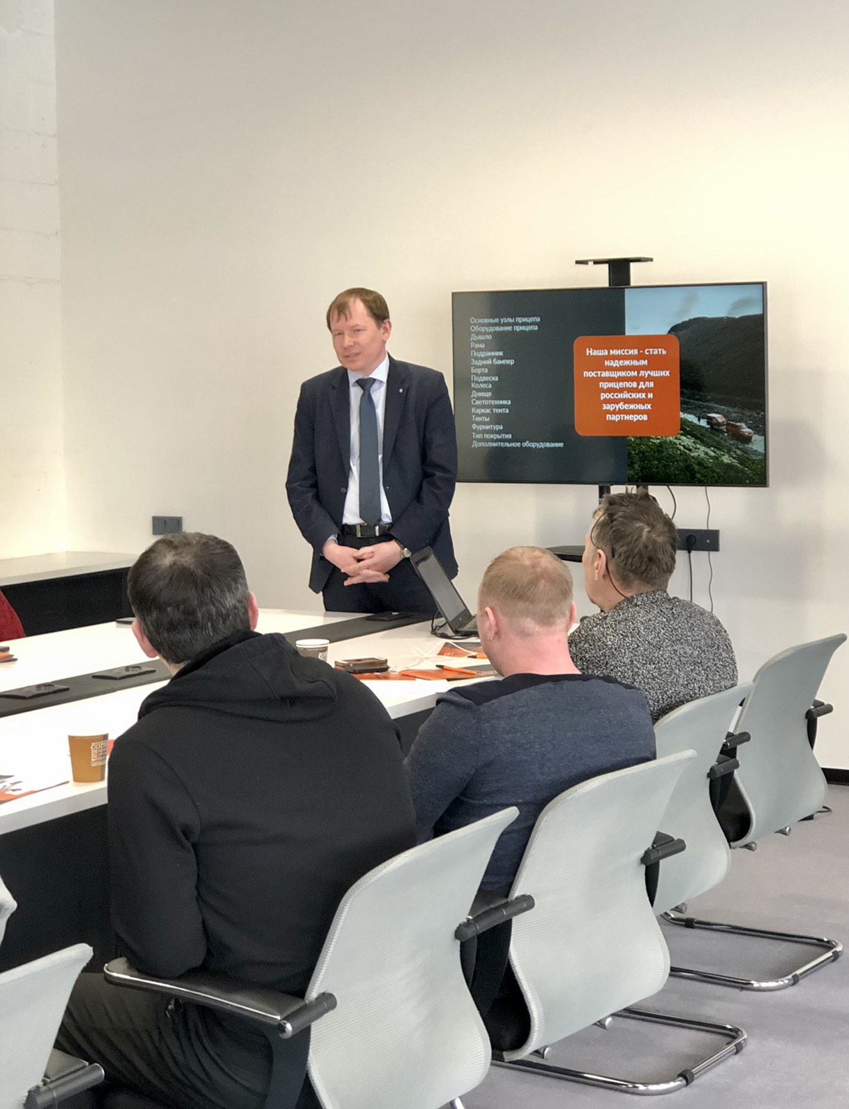 Руководитель направления Тимофей Жигалов выступил с докладом о конструктивных и конкурентных преимуществах прицепов Экспедиция, о позиционировании продукции на рынке и маркетинговых инструментах для его продвижения.
